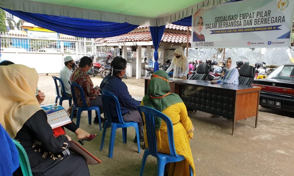 RadarSumsel.com–PALEMBANG. Hj. Eva Susanti Anggota DPD RI Dapil Sumatera Selatan (Sumsel) melaksanakan sosialisasi empat pilar kebangsaan; Pancasila, UUD 1945, NKRI, Bhinneka Tunggal Ika. Dalam acara dihadiri oleh elemen tokoh masyarakat, pemuda, aktivis mahasiswa yang ada di Kota Palembang pada hari Sabtu 27/06/2020.