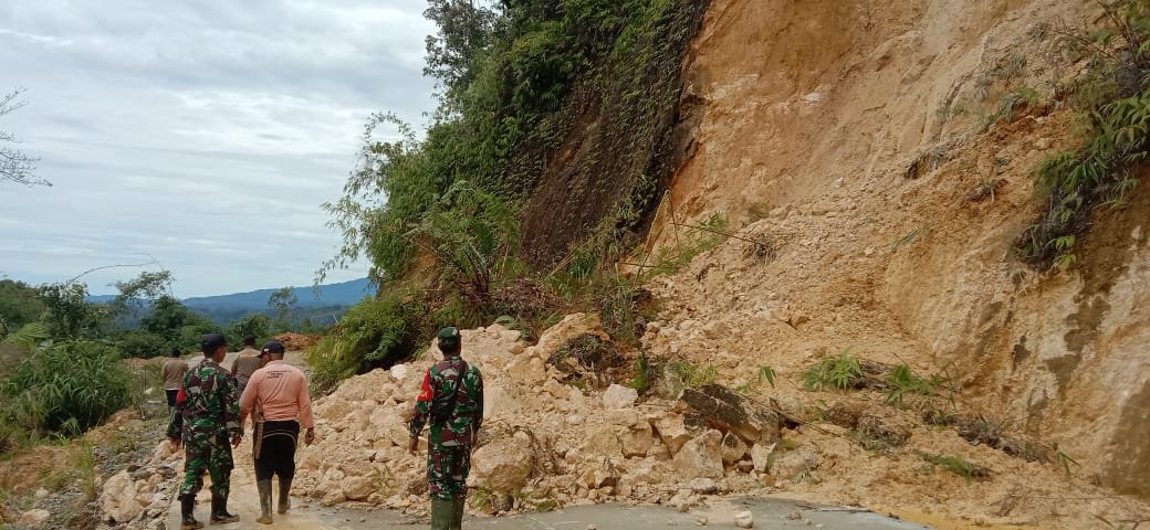 Selanjutnya Babinsa Koramil 403-11 Pulau beringin berkordinasi dengan Kepala Desa Sadau Jaya, mengenai pengerjaan matrIal longsor yang menutupi badan jalan.
